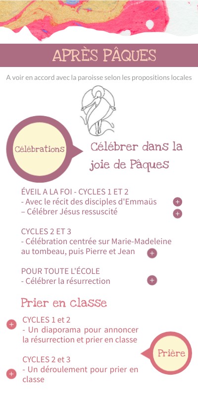 ÉVEIL A LA FOI - CYCLES 1 ET 2 - Avec le récit des disciples d'Emmaüs– Célébrer Jésus ressuscité CYCLES 2 ET 3- Célébration centrée sur Marie-Madeleine au tombeau, puis Pierre et Jean POUR TOUTE L'ÉCOLE - Célébrer la résurrection