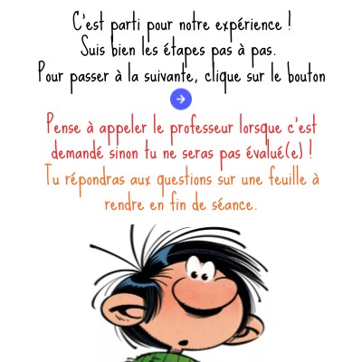 C'est parti pour notre expérience !Suis bien les étapes pas à pas. Pour passer à la suivante, clique sur le bouton Pense à appeler le professeur lorsque c'est demandé sinon tu ne seras pas évalué(e) ! Tu répondras aux questions sur une feuille à rendre en fin de séance.