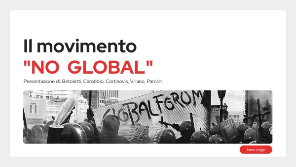 "Secondo me il movimento no global ha dei pro e dei contro e nonostante proponga delle idee anche molto importanti non penso che sarà realizzabile perché non penso che tutti siano d'accordo su questi ideali, soprattutto quelli economici." Alex Villano