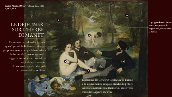 Ispirazione dal Concerto Campestre di Tiziano e da alcune stampe cinquecentesche del pittore veneziano Marcantonio Raimondi, a loro volta tratte dal Giudizio di Paride