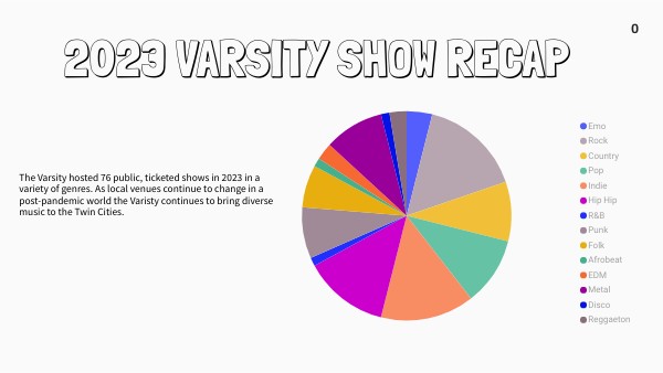 The Varsity hosted 76 public, ticketed shows in 2023 in a variety of genres. As local venues continue to change in a post-pandemic world the Varisty continues to bring diverse music to the Twin Cities.