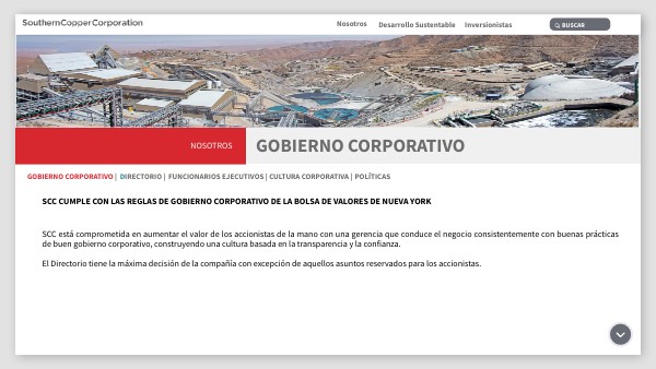 Southern Copper Corporation (SCC) está comprometida con los principios fundamentales de un buen gobierno corporativo, guiando su gestión de manera consistente con prácticas que buscan aumentar el valor para los accionistas. Nuestra empresa ha establecido un enfoque proactivo hacia la transparencia y la confianza, cumpliendo rigurosamente con los lineamientos de gobierno corporativo establecidos por la Comisión de Bolsa y Valores de los Estados Unidos (U.S. Securities and Exchange Commission). Este compromiso se refleja en la formación de un Directorio cuyo principal objetivo es maximizar el valor para nuestros accionistas, operando en estricto cumplimiento de las leyes de las jurisdicciones donde tenemos presencia y manteniendo los más altos estándares éticos en todas nuestras operaciones.