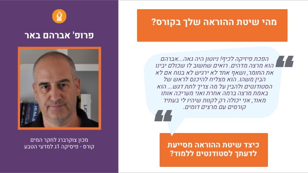 הפכת פיזיקה לכיף! ניוטון היה גאה...אברהם הוא מרצה מדהים. רואים שחשוב לו שכולם יבינו את החומר, ושאף אחד לא ירגיש לא בנוח אם לא הבין משהו. הוא מצליח להיכנס לראש של הסטודנטים ולהבין על מה צריך לתת דגש... הוא באמת מרצה ברמה אחרת ואני מעריכה אותו מאוד, אני יכולה רק לקוות שיהיו לי בעתיד קורסים עם מרצים דומים.
