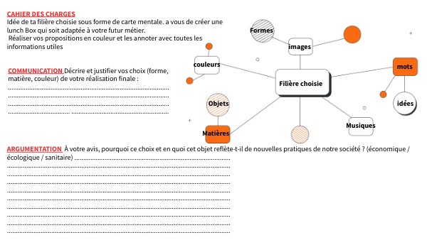 CAHIER DES CHARGES Idée de ta filière choisie sous forme de carte mentale. a vous de créer une lunch Box qui soit adaptée à votre futur métier. Réaliser vos propositions en couleur et les annoter avec toutes les informations utiles