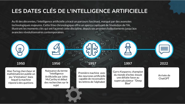 Au fil des décennies, l'intelligence artificielle a tracé un parcours fascinant, marqué par des avancées technologiques majeures. Cette frise chronologique offre un aperçu captivant de l'évolution de l'IA, illustrant les moments clés qui ont façonné cette discipline, depuis ses premiers balbutiements jusqu'aux avancées révolutionnaires contemporaines.