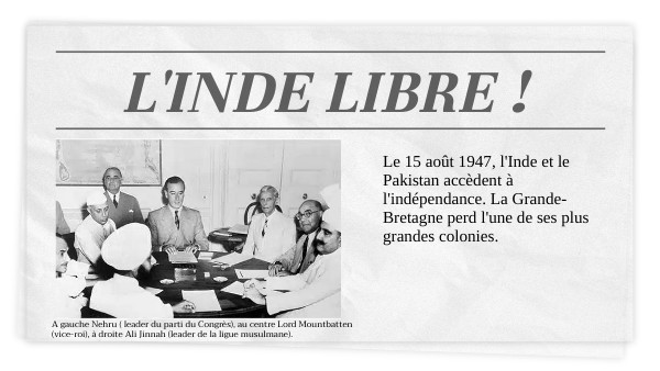 Le 15 août 1947, l'Inde et le Pakistan accèdent à l'indépendance. La Grande-Bretagne perd l'une de ses plus grandes colonies.