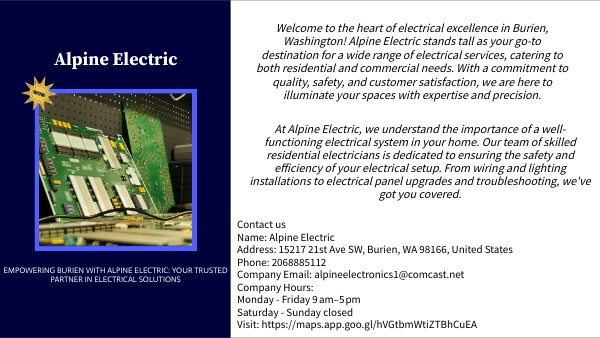 Contact us Name: Alpine Electric Address: 15217 21st Ave SW, Burien, WA 98166, United States Phone: 2068885112 Company Email: alpineelectronics1@comcast.net Company Hours: Monday - Friday 9 am–5 pm Saturday - Sunday closed Visit: https://maps.app.goo.gl/hVGtbmWtiZTBhCuEA