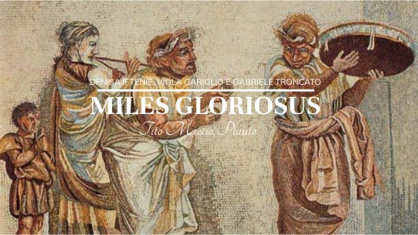 Il Miles Gloriosus ha per modello una commedia greca intitolata ‘Alazwn (Alazòn), come è infatti nel secondo atto della commedia. Non si sa chi sia l’autore di questa commedia, perché Plauto non ne fa il nome. Comunque si è pensato più volte a . In totale ha 5 atti. I motivi principali della commedia sono: - Il danno iniziale - il ricongiungimento di Filocomasio e Pleusicle - Il lieto fine
