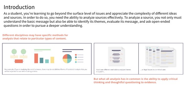 As a student, you’re learning to go beyond the surface level of issues and appreciate the complexity of different ideas and sources. In order to do so, you need the ability to analyze sources effectively. To analyze a source, you not only must understand the basic message but also be able to identify its themes, evaluate its message, and ask open-ended questions in order to pursue a deeper understanding.