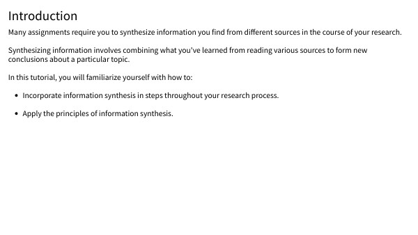 Many assignments require you to synthesize information you find from different sources in the course of your research. Synthesizing information involves combining what you've learned from reading various sources to form new conclusions about a particular topic. In this tutorial, you will familiarize yourself with how to:
