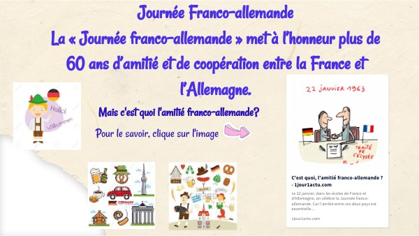 Journée Franco-allemandeLa « Journée franco-allemande » met à l’honneur plus de 60 ans d’amitié et de coopération entre la France et l’Allemagne.