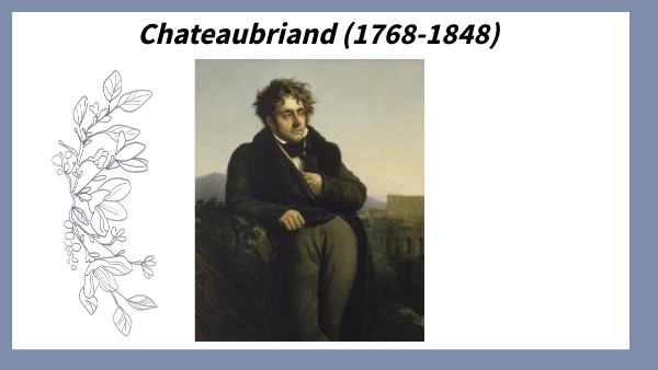 Ecrivain et homme politique, il est l'un des grands précurseurs du romantisme français. Emigré au Nouveau Monde en 1791, puis en Angleterre, Chateaubriand est ruiné.