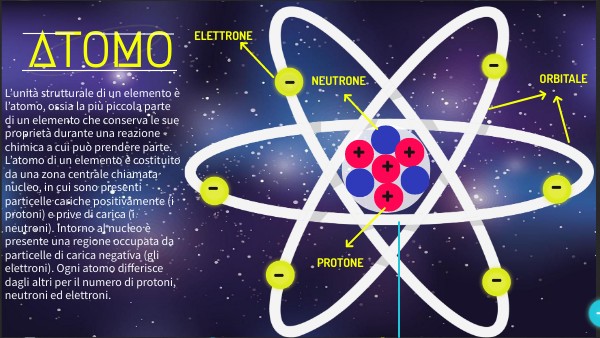 L’unità strutturale di un elemento è l’atomo, ossia la più piccola parte di un elemento che conserva le sue proprietà durante una reazione chimica a cui può prendere parte. L’atomo di un elemento è costituito da una zona centrale chiamata nucleo, in cui sono presenti particelle cariche positivamente (i protoni) e prive di carica (i neutroni). Intorno al nucleo è presente una regione occupata da particelle di carica negativa (gli elettroni). Ogni atomo differisce dagli altri per il numero di protoni, neutroni ed elettroni.