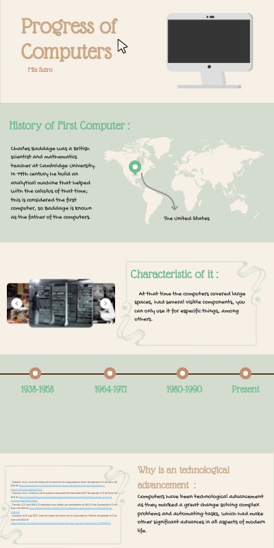 - Gallardo, A.(s.f.). Línea del tiempo de la historia de las computadoras. Sutori. Recuperado el 12 de Enero del 2024 de https://www.sutori.com/es/historia/linea-de-tiempo-de-la-historia-de-las-computadoras--dRzmTGcNGMo6U3hkKqS3CSAT - Montoya, J.(s.f.). ¿Cómo se creó la primera computadora?.Universidad EAFIT. Recuperado el 12 de Enero del 2024 de https://www.eafit.edu.co/ninos/reddelaspreguntas/maquinasyenergia/Paginas/como-se-creo-la-primera-computadora.aspx - Merodio, J.(17 June 2020). El matemático que soñaba con ordenadores en 1830. El País. Recuperado el 12 de Enero del 2024 de https://elpais.com/ciencia/2020-06-17/el-matematico-que-sonaba-con-ordenadores-en-1830.html - Casanova, A.(28 Aug 2017). Línea del tiempo del avance de las computadoras. Medium. Recuperado el 12 de Enero del 2024 de https://medium.com/@alexacasanova/linea-del-tiempo-del-avance-de-las-computadoras-77ef369554b0