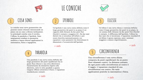 Le coniche sono curve geometriche che possono essere ottenute intersecando un piano con un cono a diverse inclinazioni. Le principali coniche sono il cerchio, l'ellisse, la parabola e l'iperbole. Sono ampiamente studiate in geometria analitica e hanno diverse applicazioni in matematica, fisica e ingegneria.