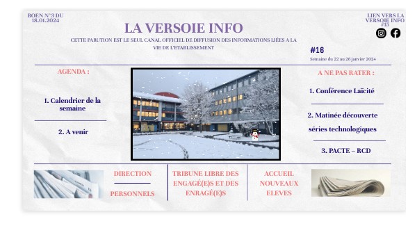 COLLECTE PROTECTIONS HYGIÉNIQUES DU 22.01.24 AU 26.01.24Une belle opération de solidarité que cette collecte de protections hygiéniques parfaitement organisée par Mia Onita, Lucie Mesquita et Juliette Vuattoux du 22.01au 26.01.24.Vous trouverez ci-après 3 affiches : PRÉSENTATION SPÉCIALITÉS CLASSES SECONDESDu 22/01 au 02/02, les membres du CVL et de la MDL, passeront dans toutes les classes de seconde pour une présentation d’½ heure des différentes spécialités des classes de premières et terminales.Ces interventions auront lieu durant les heures de "vie de classe", sauf pour les classes de Mme Abadie, Mme Boutamine, Mme Roche, Mr Lecomte et Mme Bahloul (les créneaux ne correspondaient pas).Merci de prévenir vos élèves afin de s'assurer de leur présence et de réserver un très bon accueil aux jeunes duCVL/MDL. Voici le planning : Le CVL et la MDL.Mme Constant et Mme Berger