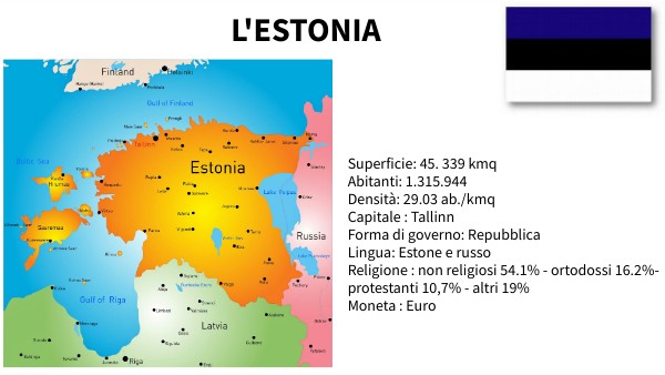 Superficie: 45. 339 kmq Abitanti: 1.315.944 Densità: 29.03 ab./kmq Capitale : Tallinn Forma di governo: Repubblica Lingua: Estone e russo Religione : non religiosi 54.1% - ortodossi 16.2%- protestanti 10,7% - altri 19% Moneta : Euro