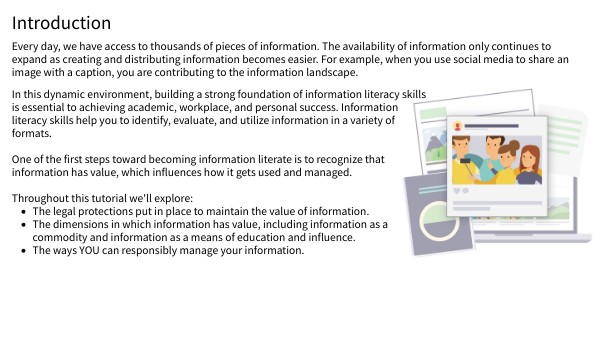 In this dynamic environment, building a strong foundation of information literacy skills is essential to achieving academic, workplace, and personal success. Information literacy skills help you to identify, evaluate, and utilize information in a variety of formats. One of the first steps toward becoming information literate is to recognize that information has value, which influences how it gets used and managed. Throughout this tutorial we'll explore: