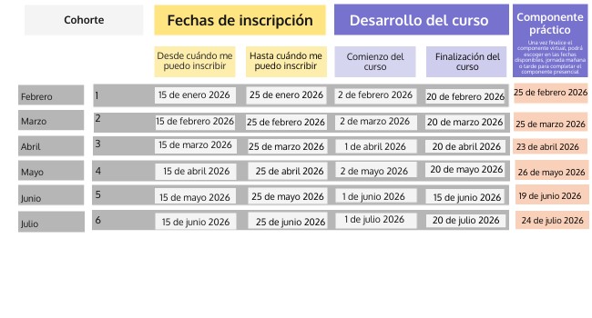 Una vez finalice el componente virtual, podrá escoger en las fechas disponibles, jornada mañana o tarde para completar el componente presencial