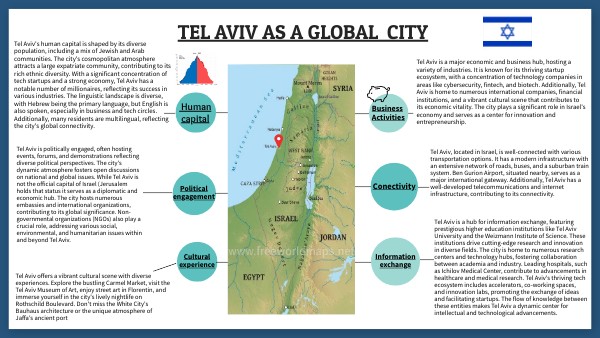Tel Aviv, located in Israel, is well-connected with various transportation options. It has a modern infrastructure with an extensive network of roads, buses, and a suburban train system. Ben Gurion Airport, situated nearby, serves as a major international gateway. Additionally, Tel Aviv has a well-developed telecommunications and internet infrastructure, contributing to its connectivity.