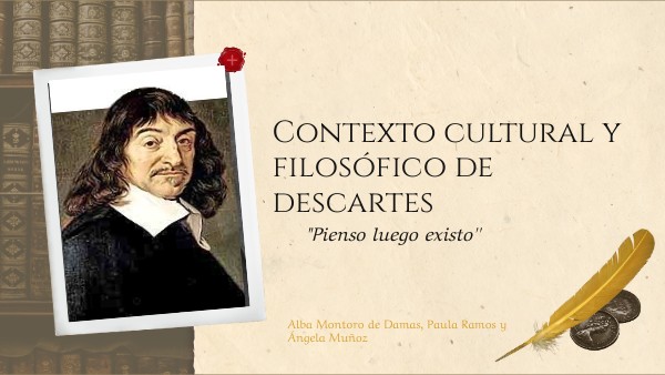 Nació en La Haye (Francia) en 1596 y murió en suecia en 1650, es considerado el padre de la filosofía moderna así como también el precursor o iniciador del racionalismo. Fue educado en colegios jesuitas donde recibe una educación clásdica y cientíica y luego inició unos estudios de derecho. Pensó en desarrollar un método universal para la ciencia y la filosofía. El contexto del siglo XVII vendrá marcado por los cmabios producidos durante el Renacimiento; este había supuesto el in icio de la ruptura con los medieval. EL siglo XVII, será un siglo de crisis a consecuencia de la revolución científica y de la destrucción de la unidad religiosa que desencadenará una crisis política. Respecto a la primera renovación de la ciencia al abandonarse el modelo geoceéntrico aristotélico y optarse por un método mucho más riguroso y lógico. Copérnico sitúa al sol en el centro del Universo, Kepler nos permite hablar ya de un sistema solar y Galileo aporta un efoque matemático que le lleva a tener probloemas con la Iglesia.