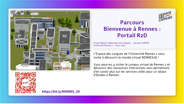 L'Espace des Langues de l'Université Rennes 2 vous invite à découvrir le monde virtuel RENNES2D ! Vous pourrez y visiter le campus virtuel de Rennes 2 et découvrir des ressources interactives vous permettant d'en savoir plus sur les services utiles pour un séjour d'études à Rennes.