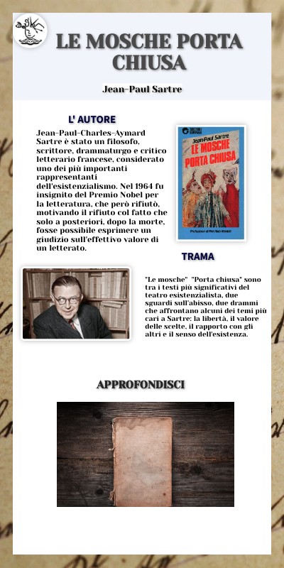 "Le mosche" "Porta chiusa" sono tra i testi più significativi del teatro esistenzialista, due sguardi sull'abisso, due drammi che affrontano alcuni dei temi più cari a Sartre: la libertà, il valore delle scelte, il rapporto con gli altri e il senso dell'esistenza.