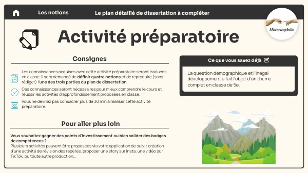 Les connaissances acquises avec cette activité préparatoire ne feront pas l'objet d'une évaluation des connaissances, mais d'une activité menée en classe. Vous ne devriez pas consacrer plus de 30 min à réaliser cette activité préparatoire.