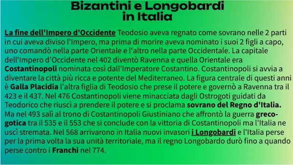 La fine dell'Impero d'Occidente Teodosio aveva regnato come sovrano nelle 2 parti in cui aveva diviso l'Impero, ma prima di morire aveva nominato i suoi 2 figli a capo, uno comandò nella parte Orientale e l'altro nella parte Occidentale. La capitale dell'Impero d'Occidente nel 402 diventò Ravenna e quella Orientale era Costantinopoli nominata così dall'Imperatore Costantino. Costantinopoli si avvia a diventare la città più ricca e potente del Mediterraneo. La figura centrale di questi anni è Galla Placidia l'altra figlia di Teodosio che prese il potere e governò a Ravenna tra il 423 e il 437. Nel 476 Costantinopoli viene minacciata dagli Ostrogoti guidati da Teodorico che riuscì a prendere il potere e si proclama sovrano del Regno d'Italia. Ma nel 493 salì al trono di Costantinopoli Giustiniano che affrontò la guerra greco-gotica tra il 535 e il 553 che si conclude con la vittoria di Costantinopoli ma l'Italia ne uscì stremata. Nel 568 arrivarono in Italia nuovi invasori i Longobardi e l'Italia perse per la prima volta la sua unità territoriale, ma il regno Longobardo durò fino a quando perse contro i Franchi nel 774.