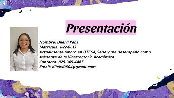 Nombre: Dileivi Peña Matrícula: 1-22-0613 Actualmente laboro en UTESA, Sede y me desempeño como Asistente de la Vicerrectoría Académica. Contacto: 829-945-4467 Email: dileivi0604@gmail.com