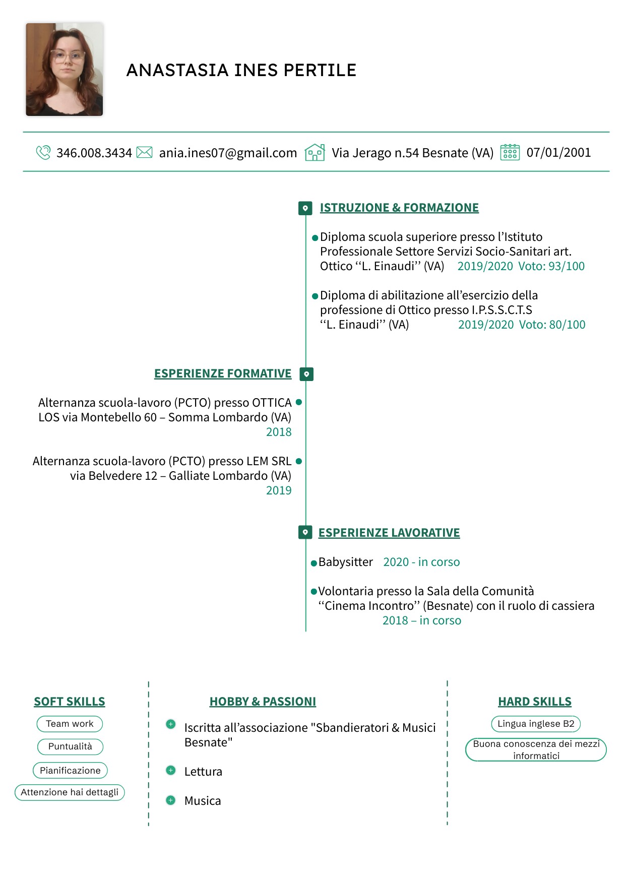 ISTRUZIONE & FORMAZIONEDiploma scuola superiore presso l’Istituto Professionale Settore Servizi Socio-Sanitari art. Ottico ‘‘L. Einaudi’’ (VA) 2019/2020 Voto: 93/100Diploma di abilitazione all’esercizio della professione di Ottico presso I.P.S.S.C.T.S ‘‘L. Einaudi’’ (VA) 2019/2020 Voto: 80/100