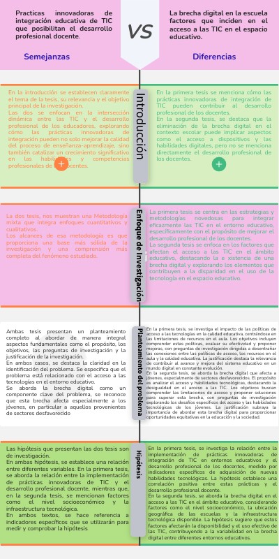 La primera tesis se centra en las estrategias y metodologías novedosas para integrar eficazmente las TIC en el entorno educativo, específicamente con el propósito de mejorar el desarrollo profesional de los docentes. La segunda tesis se enfoca en los factores que afectan el acceso a las TIC en el ámbito educativo, destacando la e xistencia de una brecha digital y explorando los elementos que contribuyen a la disparidad en el uso de la tecnología en el espacio educativo.