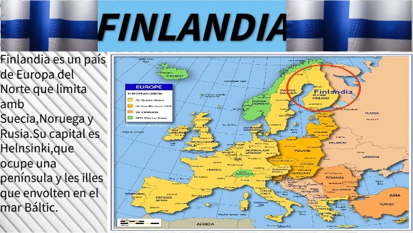 Finlandia es un país de Europa del Norte que limita amb Suecia,Noruega y Rusia.Su capital es Helnsinki,que ocupe una península y les illes que envolten en el mar Báltic.