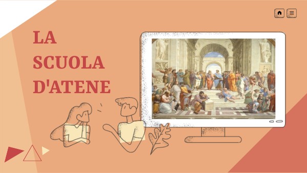 I due personaggi centrali sono Aristotele e Platone, il primo indica il cielo, ricordando che secondo le sue concezioni il mondo non è che una brutta copia di una realtà ideale e superiore, il secondo ,con un braccio, teso davanti a sè, vuole significare che l'unica realtà possibile è quella concreta in cui viviamo, quella sensibile, cioè percepibile dai nostri sensi. Raffaello ha voluto rappresentare i personaggi con caratteristiche fisiche simili a quelle degli artisti che conosceva. Infatti Platone dovrebbe essere Leonardo. Altri personaggi come Euclide che è ritratto come Bramante, che è chinato a tracciare disegni geometrici con le sèste. Eraclito che è Michelagelo, il quale annota qualcosa su un foglio su un blocco marmoreo.