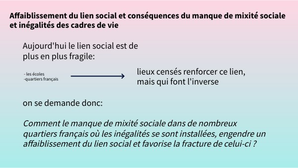 on se demande donc: Comment le manque de mixité sociale dans de nombreux quartiers français où les inégalités se sont installées, engendre un affaiblissement du lien social et favorise la fracture de celui-ci ?