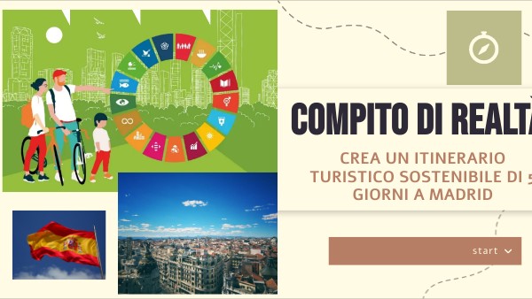 Lavori in un’agenzia di viaggio e devi proporre un pacchetto turistico a una famiglia (genitori, due figli adolescenti di cui uno con una disabilità motoria). DURATA: 5 giorni LUOGO: Madrid TIPO DI VIAGGIO: SOSTENIBILE Progetta un itinerario turistico, rispettando i criteri di turismo sostenibile visti durante la videolezione (trasporti, alloggio, ristoranti). Crea un VOLANTINO PROMOZIONALE/PRESENTAZIONE DELL'OFFERTA TURISTICA tramite Canva o altre TIC.