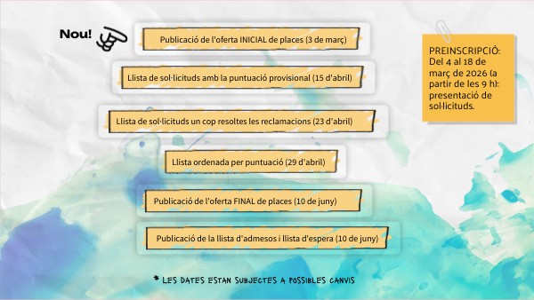 PREINSCRIPCIÓ:Del 4 al 18 de març de 2026 (a partir de les 9 h): presentació de sol·licituds.