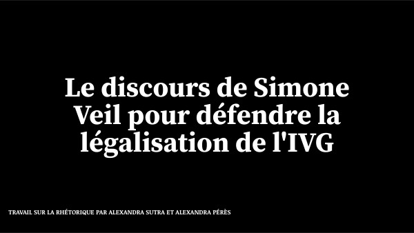 «Monsieur le Président, Mesdames, Messieurs, si j’interviens aujourd’hui à cette tribune, Ministre de la Santé, femme et non-parlementaire, pour proposer aux élus de la nation une profonde modification de la législation sur l’avortement, croyez bien que c’est avec un profond sentiment d’humilité devant la difficulté du problème, comme devant l’ampleur des résonances qu’il suscite au plus intime de chacun des Français et des Françaises, et en pleine conscience de la gravité des responsabilités que nous allons assumer ensemble. Mais c’est aussi avec la plus grande conviction que je défendrai un projet longuement réfléchi et délibéré pour l’ensemble du gouvernement, un projet qui, selon les termes même du président de la République, a pour objet de «mettre fin à une situation de désordre et d’injustice et d’apporter une solution mesurée et humaine à un des problèmes les plus difficiles de notre temps».