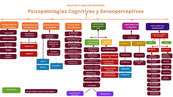Referencias: Belloch, A., Sandín, B., y Ramos, F. (2008). Manual de Psicopatología. McGraw-Hill. Vol. 8. https://aulavirtual.ibero.edu.co/repositorio/Cursos-Matriz/Psicolog%C3%ADa/Psicopatolog%C3%ADa-I/MD/Beloch%2C%20Amparo%20Manual%20de%20psicopatolog%C3%ADa.%20Volumen%20I.pdf García, O., (s/f). Distorsiones sensoperceptivas. En Psicopatología del adulto y adulto mayor. [Módulo en línea]. Universidad Virtual del Estado de Guanajuato. https://avalicmod19c.uveg.edu.mx/mod/scorm/player.php?a=4093¤torg=PAAM_U2_L4_ORG&scoid=8764 García, O., (s/f). Patologías del pensamiento. En Psicopatología del adulto y adulto mayor. [Módulo en línea]. Universidad Virtual del Estado de Guanajuato. https://avalicmod19c.uveg.edu.mx/mod/scorm/player.php?a=4097¤torg=PAAM_U2_L6_ORG&scoid=8772 García, O., (s/f). Trastornos de la conciencia, orientación y atención. En Psicopatología del adulto y adulto mayor. [Módulo en línea]. Universidad Virtual del Estado de Guanajuato. https://avalicmod19c.uveg.edu.mx/mod/scorm/player.php?a=4091¤torg=PAAM_U2_L3_ORG&scoid=8760 García, O., (s/f). Trastornos de la memoria. En Psicopatología del adulto y adulto mayor. [Módulo en línea]. Universidad Virtual del Estado de Guanajuato. https://avalicmod19c.uveg.edu.mx/mod/scorm/player.php?a=4095¤torg=PAAM_U2_L5_ORG&scoid=8768 Martín, E., M., (2010). ¿Cuáles son las alteraciones del habla más frecuentes? Pedagogía Magna. (8). file:///C:/Users/Fam.%20Ramirez/Downloads/Dialnet-CualesSonLasAlteracionesDelHablaMasFrecuentes-3628010.pdf Portellano, J., A., (2005). Introducción a la Neuropsicología. Rojo Amanecer. MCGrawHill. https://clea.edu.mx/biblioteca/files/original/43a9d63fc649d7606bd928a7bdf87ca7.pdf Riol, J., M., Gómez, N., Garzón, L., Colomina, K., y Rodríguez, Y., (2017). Síndrome de Gerstmann completo. Revista Cubana de Medicina, 56(1), 81-84. http://scielo.sld.cu/scielo.php?script=sci_arttext&pid=S0034-75232017000100009&lng=es&tlng=es.