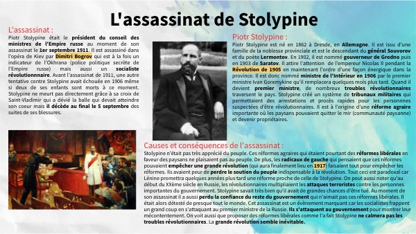 Stolypine n'était pas très apprécié du peuple. Ces réformes agraires qui étaient pourtant des réformes libérales en faveur des paysans ne plaisaient pas au peuple. De plus, les radicaux de gauche qui pensaient que ces réformes pouvaient empêcher une grande révolution (qui aura finalement lieu en 1917) faisaient tout pour empêcher les réformes. Ils avaient peur de perdre le soutien du peuple indispensable à la révolution. Tout ceci est paradoxal car Lénine promettra quelques années plus tard une réforme proche de celle de Stolypine. On peut aussi noter qu'au début du XXème siècle en Russie, les révolutionnaires multipliaient les attaques terroristes contre les personnes importantes du gouvernement. Stolypine savait très bien qu'il avait de grandes chances d'être tué. Au moment de son assassinat il a aussi perdu la confiance du reste du gouvernement qui n'aimait pas ces réformes libérales. Il était alors détesté de presque tout le monde. Cet assassinat est un évènement marquant car les socialistes frappent un grand coup en s'attaquant au premier ministre de la Russie. Ils s'attaquent au gouvernement pour montrer leur mécontentement. On voit aussi que proposer des réformes libérales comme l'a fait Stolypine ne calmera pas les troubles révolutionnaires. La grande révolution semble inévitable.