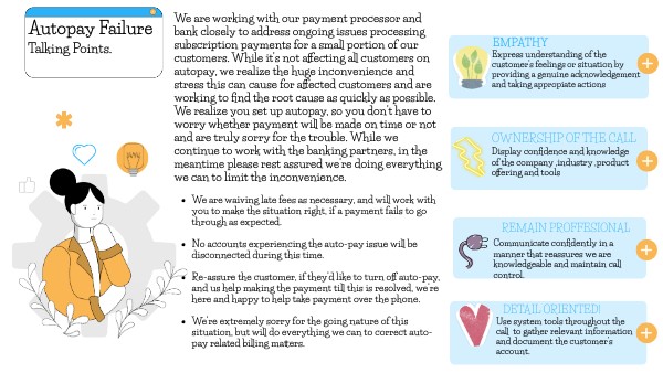 - Re-assure the customer, if they'd like to turn off auto-pay, and us help making the payment till this is resolved, we're here and happy to help take payment over the phone.
