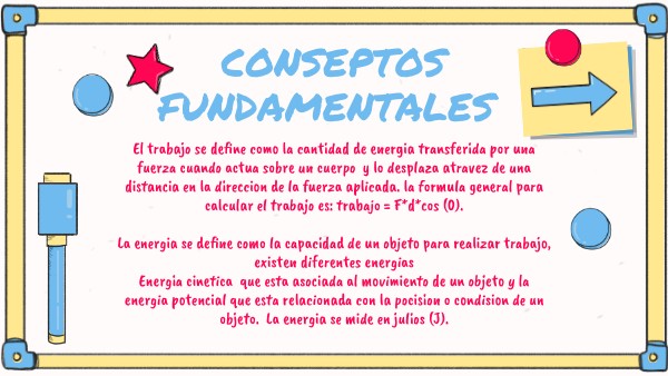 El trabajo se define como la cantidad de energia transferida por una fuerza cuando actua sobre un cuerpo y lo desplaza atravez de una distancia en la direccion de la fuerza aplicada. la formula general para calcular el trabajo es: trabajo = F*d*cos (0). La energia se define como la capacidad de un objeto para realizar trabajo, existen diferentes energias Energia cinetica que esta asociada al movimiento de un objeto y la energia potencial que esta relacionada con la pocision o condision de un objeto. La energia se mide en julios (J).