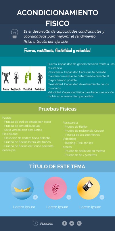 Fuerza: Capacidad de generar tensión frente a una resistenciaResistencia: Capacidad fisica que te permite mantener un esfuerzo determinado durante el mayor tiempo posible Flexibilidad: Capacidad de estiramiento de los musculos Velocidad: Capacidad fisica para hacer una acción motriz en el menor tiempo posible.