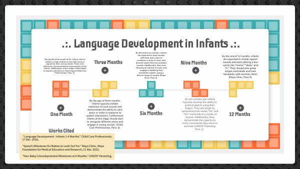 “Language Development - Infants 1-4 Months.” Child Care Professionals, 17 Dec. 2016, “Speech Milestones for Babies to Look Out For.” Mayo Clinic, Mayo Foundation for Medical Education and Research, 11 Mar. 2023, “Your Baby’s Developmental Milestones at 9 Months.” UNICEF Parenting,