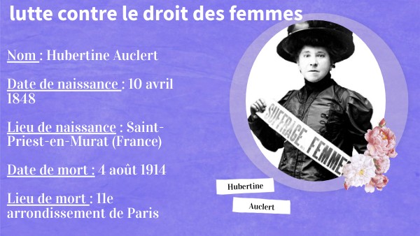 Nom : Hubertine AuclertDate de naissance : 10 avril 1848 Lieu de naissance : Saint-Priest-en-Murat (France) Date de mort : 4 août 1914 Lieu de mort : 11e arrondissement de Paris