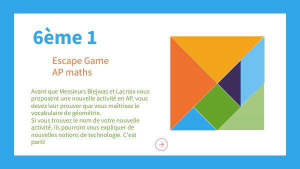 Avant que Messieurs Blejwas et Lacroix vous proposent une nouvelle activité en AP, vous devez leur prouver que vous maîtrisez le vocabulaire de géométrie. Si vous trouvez le nom de votre nouvelle activité, ils pourront vous expliquer de nouvelles notions de technologie. C'est parti!