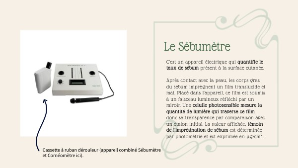 C'est un appareil électrique qui quantifie le taux de sébum présent à la surface cutanée.Après contact avec la peau, les corps gras du sébum imprègnent un film translucide et mat. Placé dans l'appareil, ce film est soumis à un faisceau lumineux réfléchi par un miroir. Une celulle photosensible mesure la quantité de lumière qui traverse ce film donc sa transparence par comparaison avec un étalon initial. La valeur affichée, témoin de l'imprégnation de sébum est déterminée par photométrie et est exprimée en µg/cm².