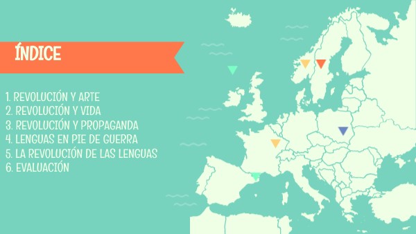1. REVOLUCIÓN Y ARTE 2. REVOLUCIÓN Y VIDA 3. REVOLUCIÓN Y PROPAGANDA 4. LENGUAS EN PIE DE GUERRA 5. LA REVOLUCIÓN DE LAS LENGUAS 6. EVALUACIÓN