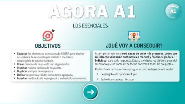 Al completar este nivel seré capaz de crear mis primeros juegos con AGORA con validación automática o manual y feedback global e individual para cada respuesta. Estas actividades regularán el paso del alumnado que no conteste de forma correcta a todas las preguntas. Podré ofrecer a mi alumnado preguntas con dos tipos de respuesta: