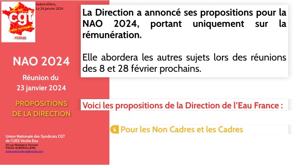 La Direction a annoncé ses propositions pour la NAO 2024, portant uniquement sur la rémunération. Elle abordera les autres sujets lors des réunions des 8 et 28 février prochains.